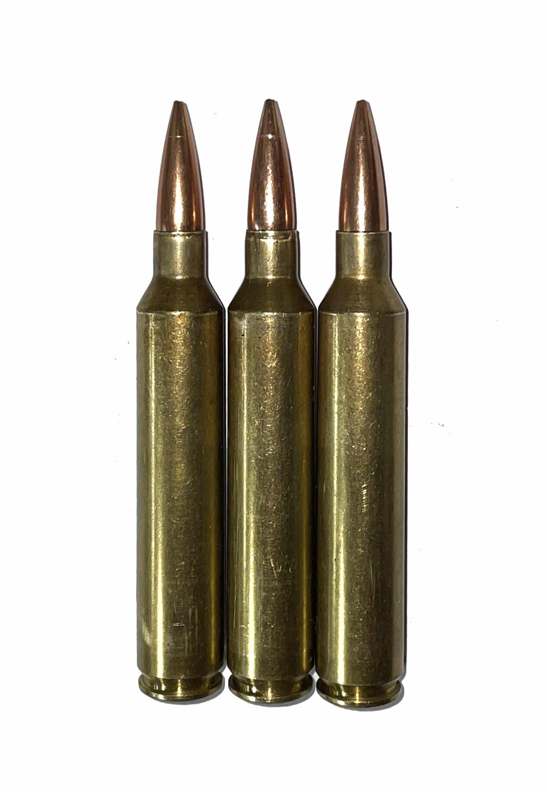 Set of three 7mm Remington Ultra Magnum (7mm Rem Ultra Mag, 7mm RUM) dummy rounds / snap-caps / fake bullets.