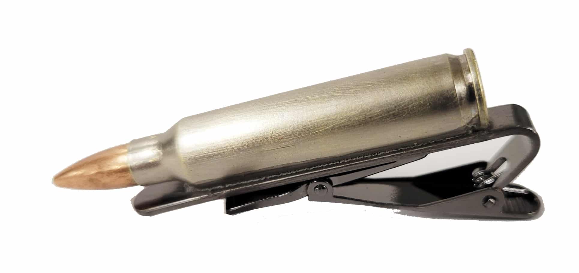 Nickel tie clip made with one of our .223 Remington / 5.56 NATO dummy rounds / snap caps / fake bullets which are completely INERT – J&M Spec.